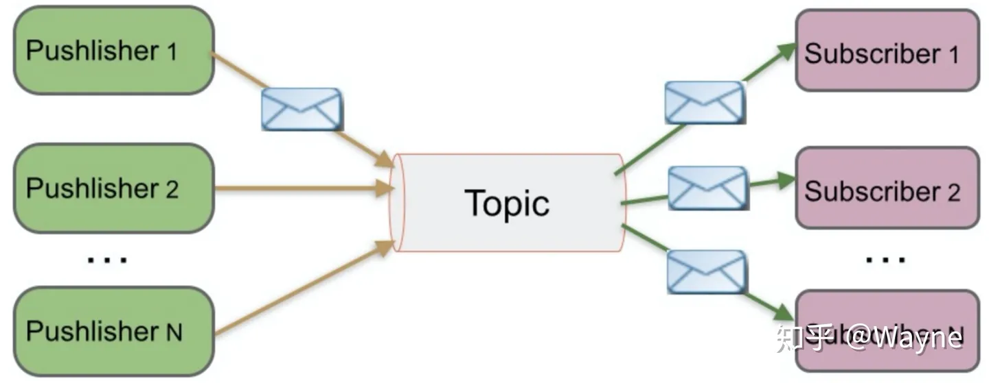 Publisher将消息发布到主题Topic中,同时有多个消息消费者Subscriber消费该消息。 - 和PTP方式不同,发布到